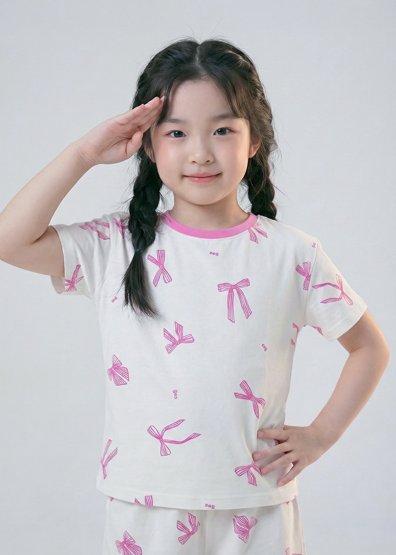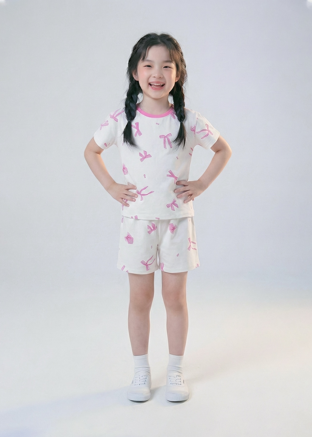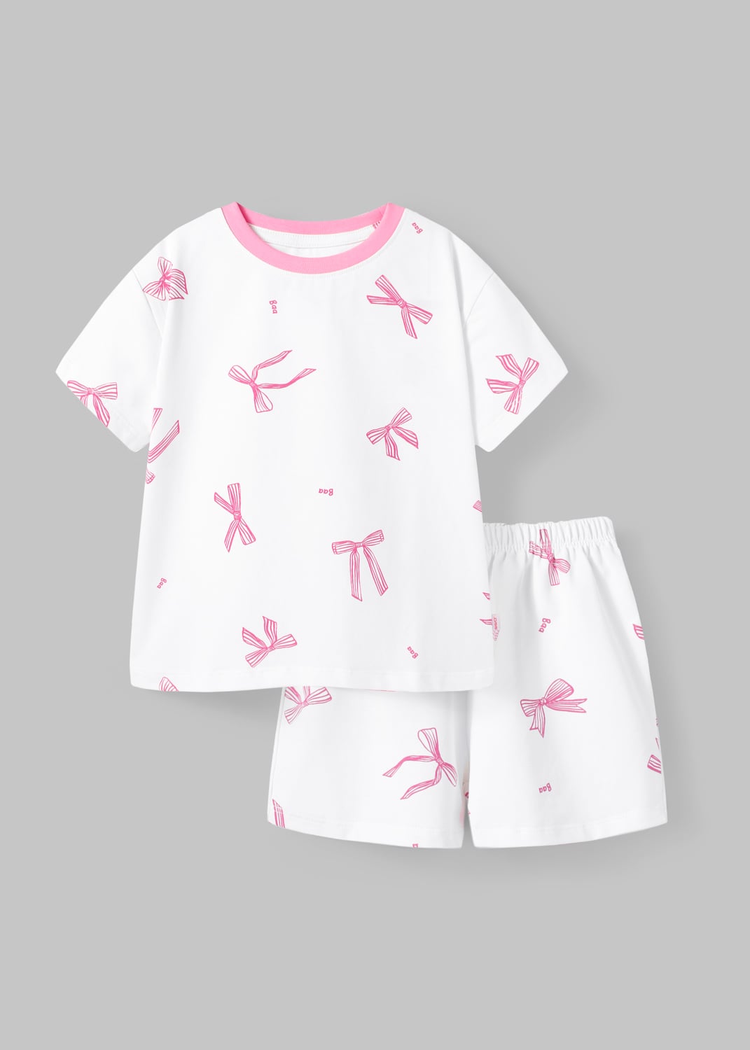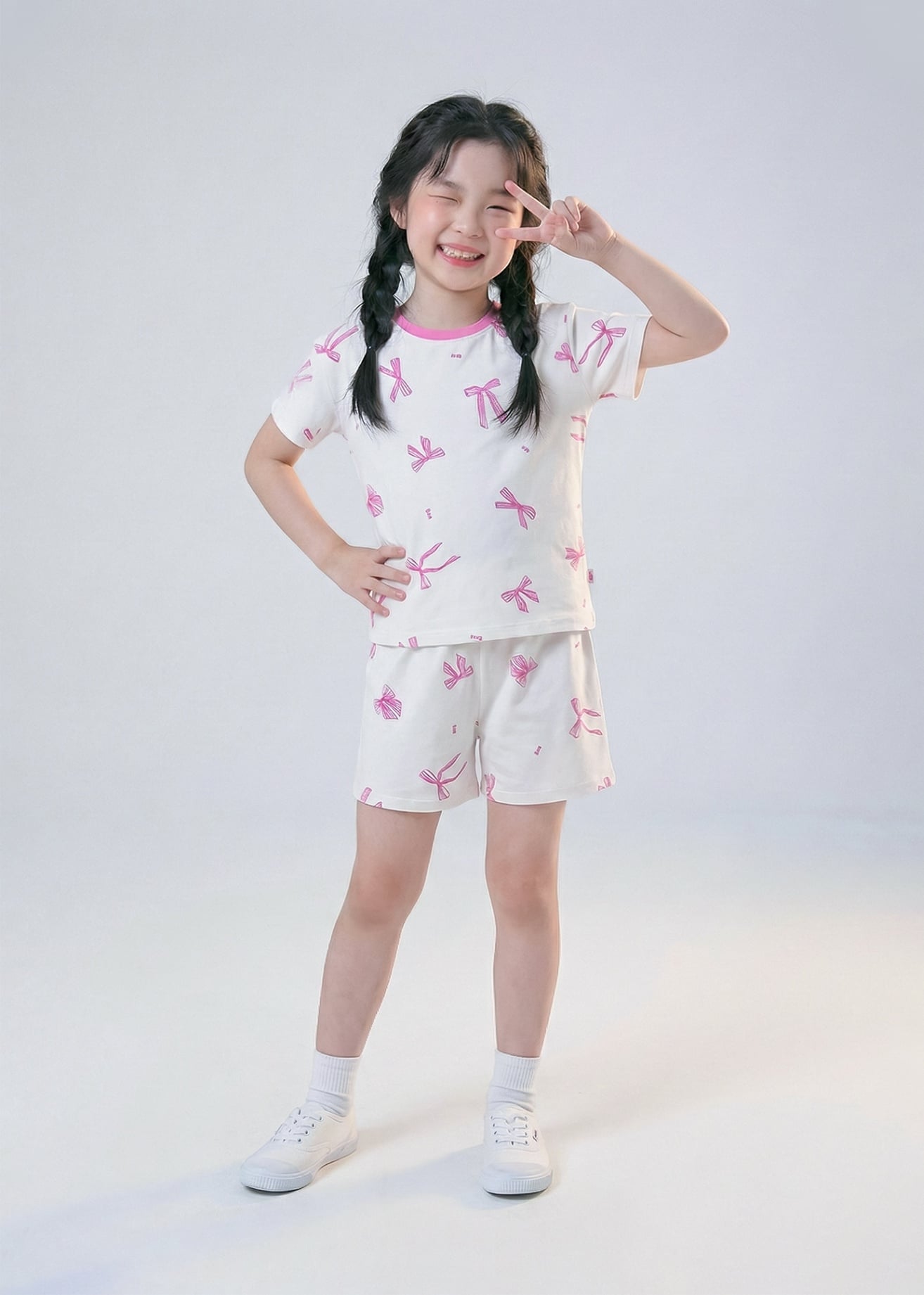Bộ Thun Ngắn Tay Bé Gái Form Rộng Trắng Hoạ Tiết Nơ