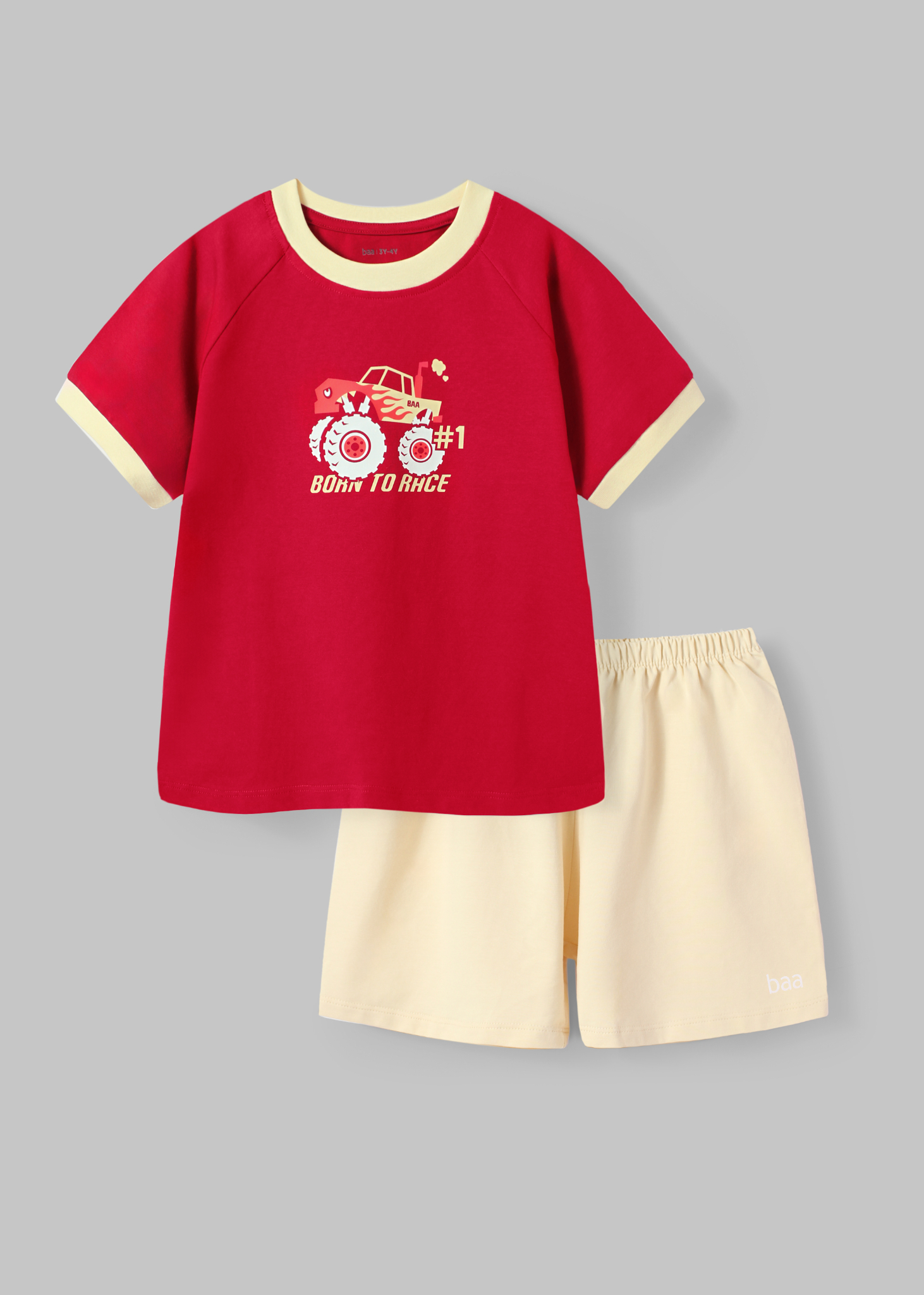 Bộ Thun Ngắn Tay Bé Trai Đỏ Burgundy Xe Đua Phối Be