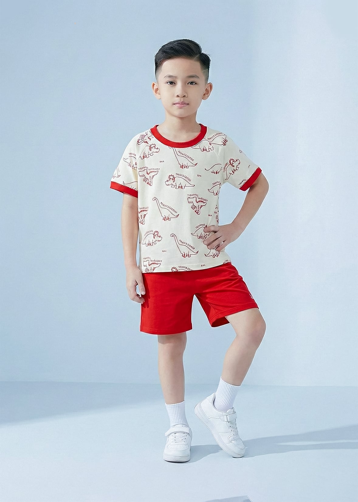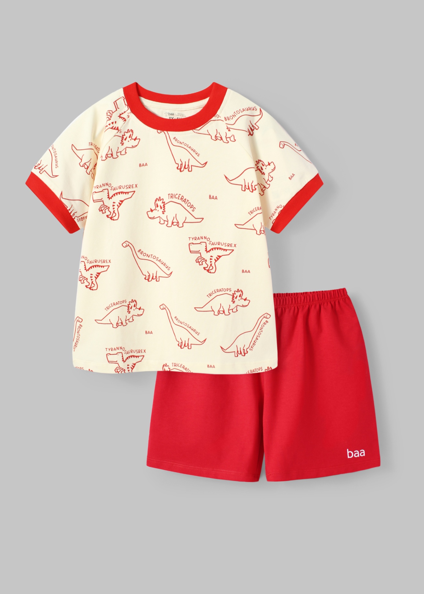 Bộ Thun Ngắn Tay Bé Trai Kem Hoạ Tiết Khủng Long Phối Đỏ