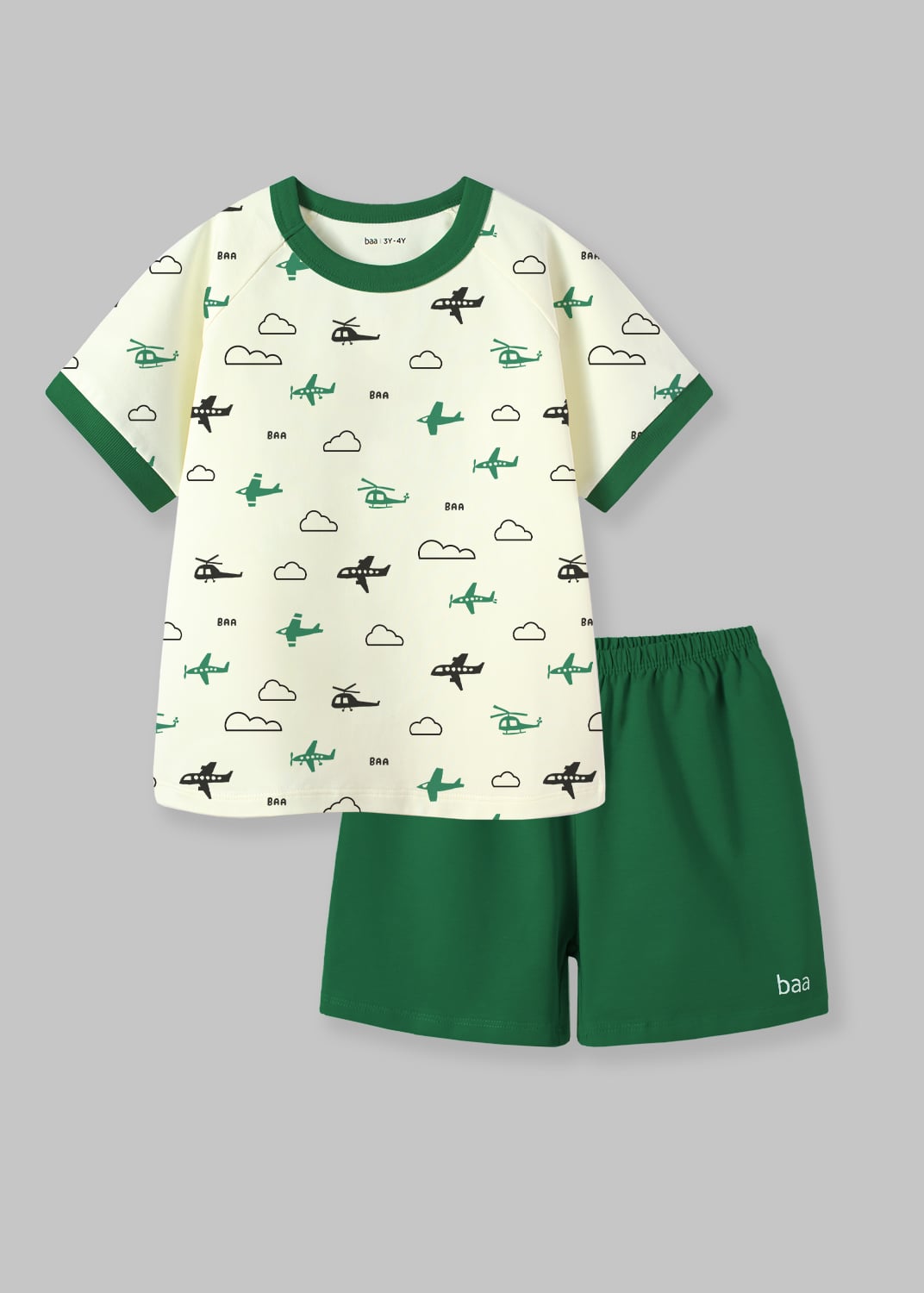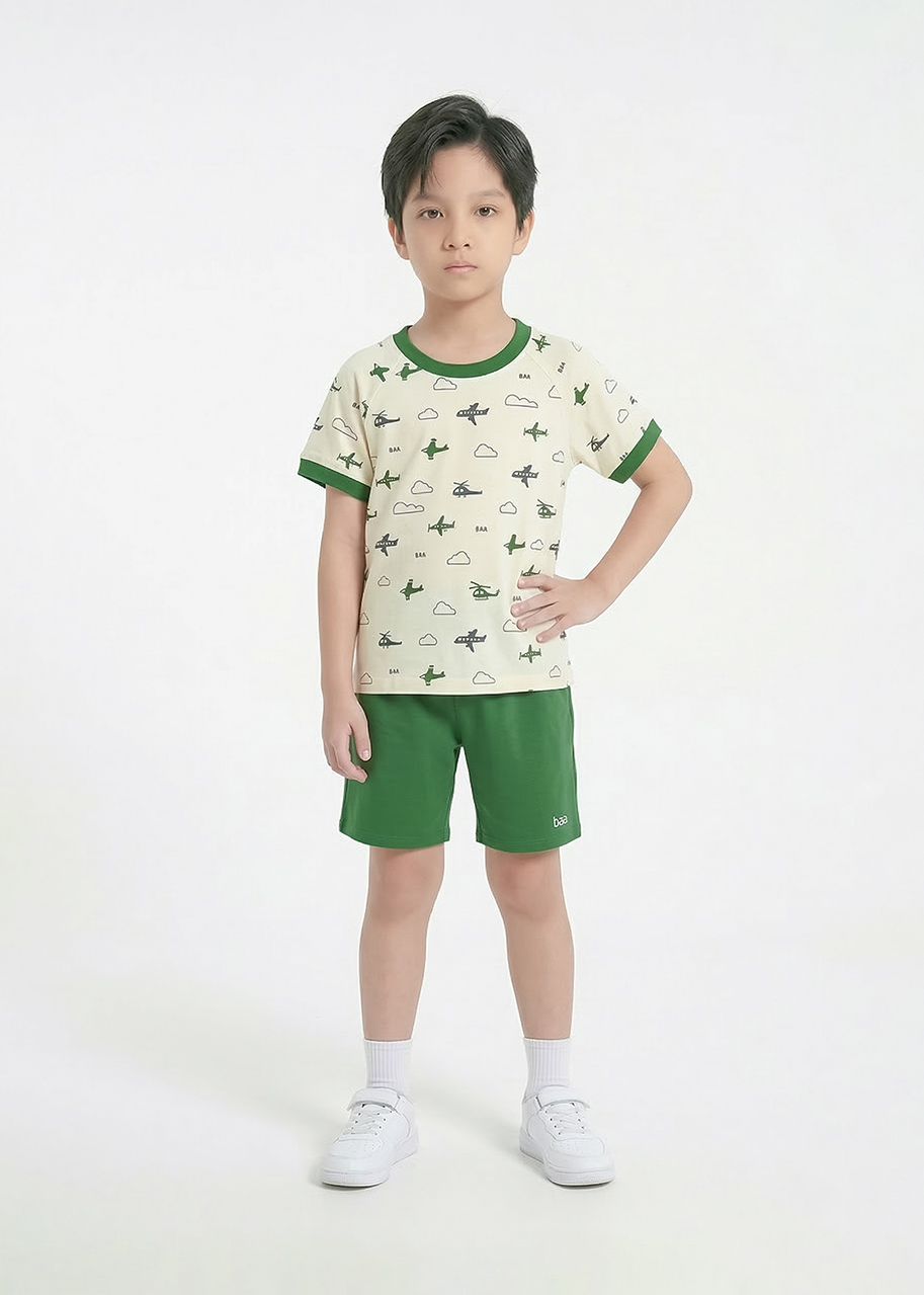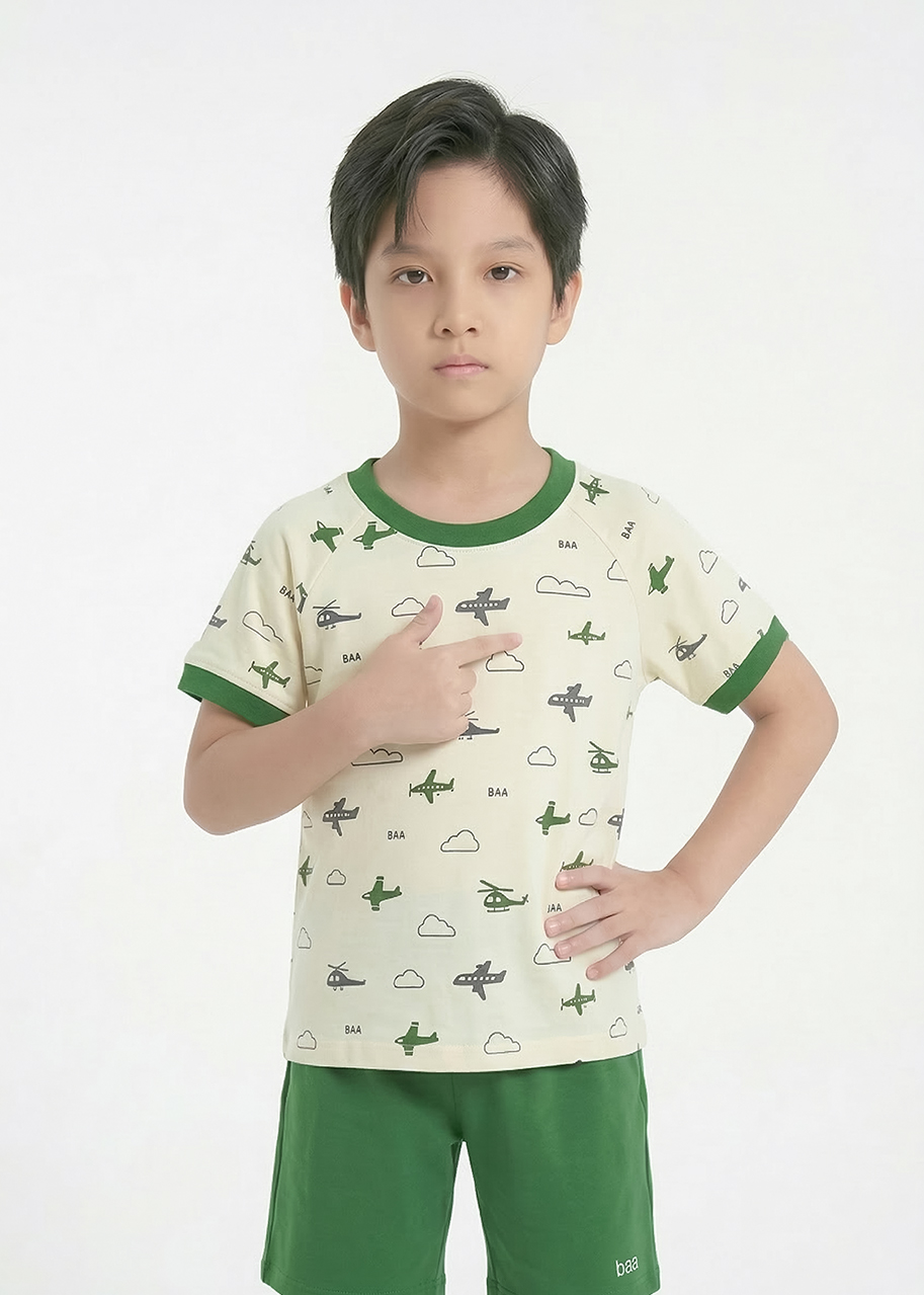 Bộ Thun Ngắn Tay Bé Trai Kem Hoạ Tiết Máy Bay Phối Xanh Lá