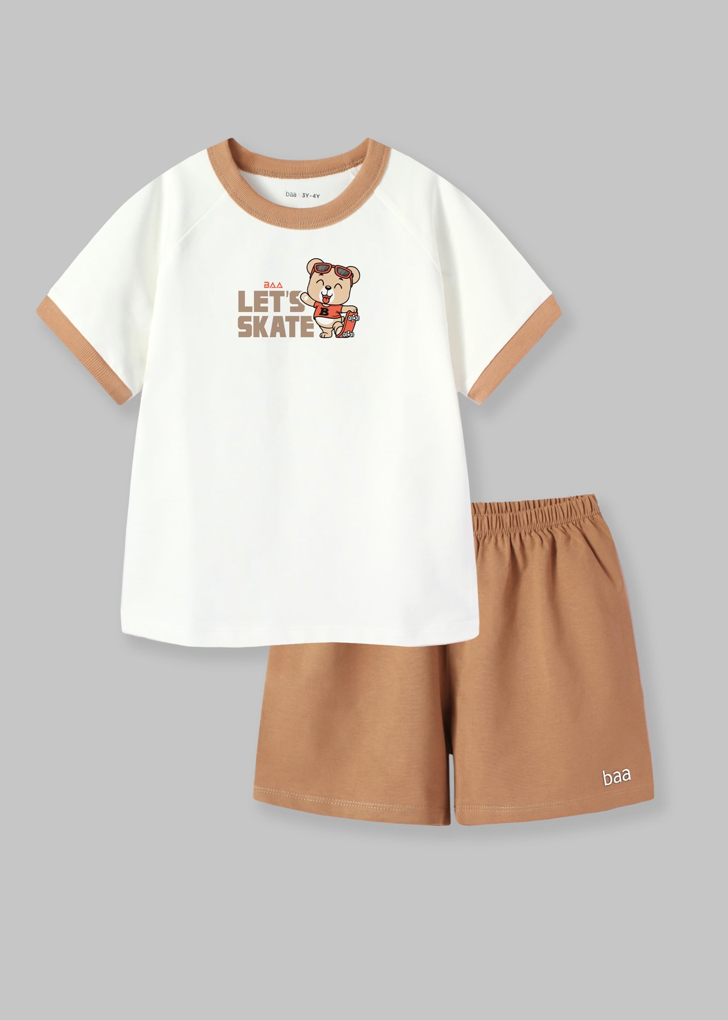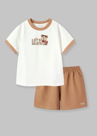 Bộ Thun Ngắn Tay Bé Trai Trắng Phối Nâu Gấu Trượt Ván