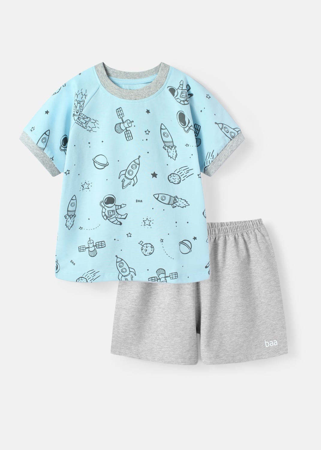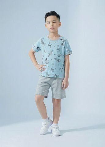 Bộ Thun Ngắn Tay Bé Trai Xanh Biển Hoạ Tiết Vũ Trụ Phối Xám