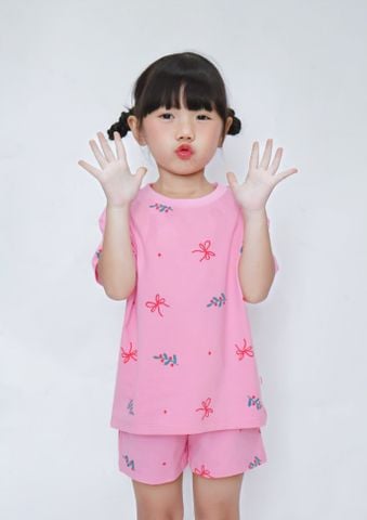 Bộ Thun Ngắn Tay Form Rộng Bé Gái Hồng Hoạ Tiết Christmas