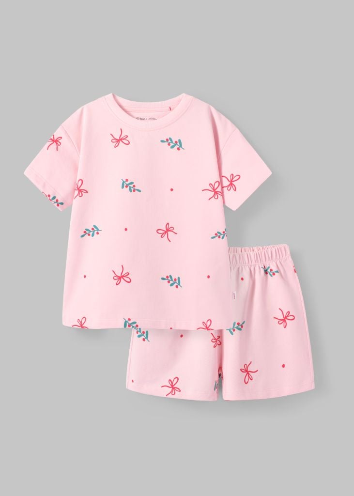 Bộ Thun Ngắn Tay Form Rộng Bé Gái Hồng Nhạt Hoạ Tiết Christmas