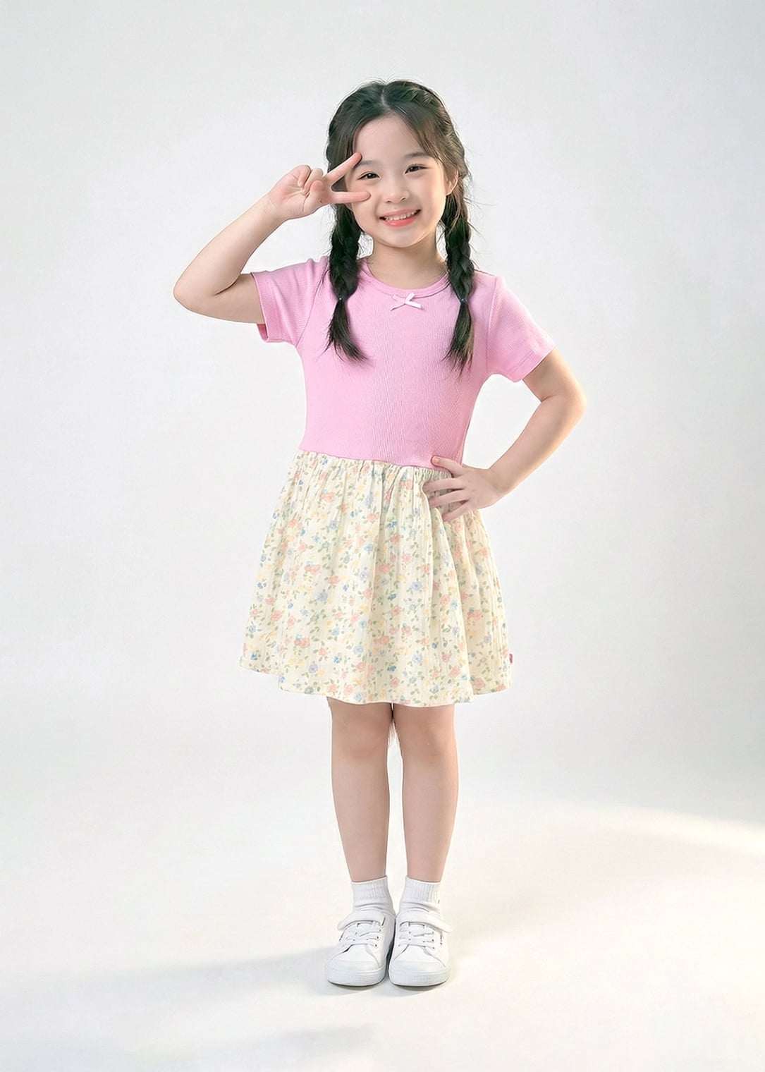 Đầm Ngắn Tay Bé Gái Thun Gân Phối Muslin Hồng Hoạ Tiết Hoa