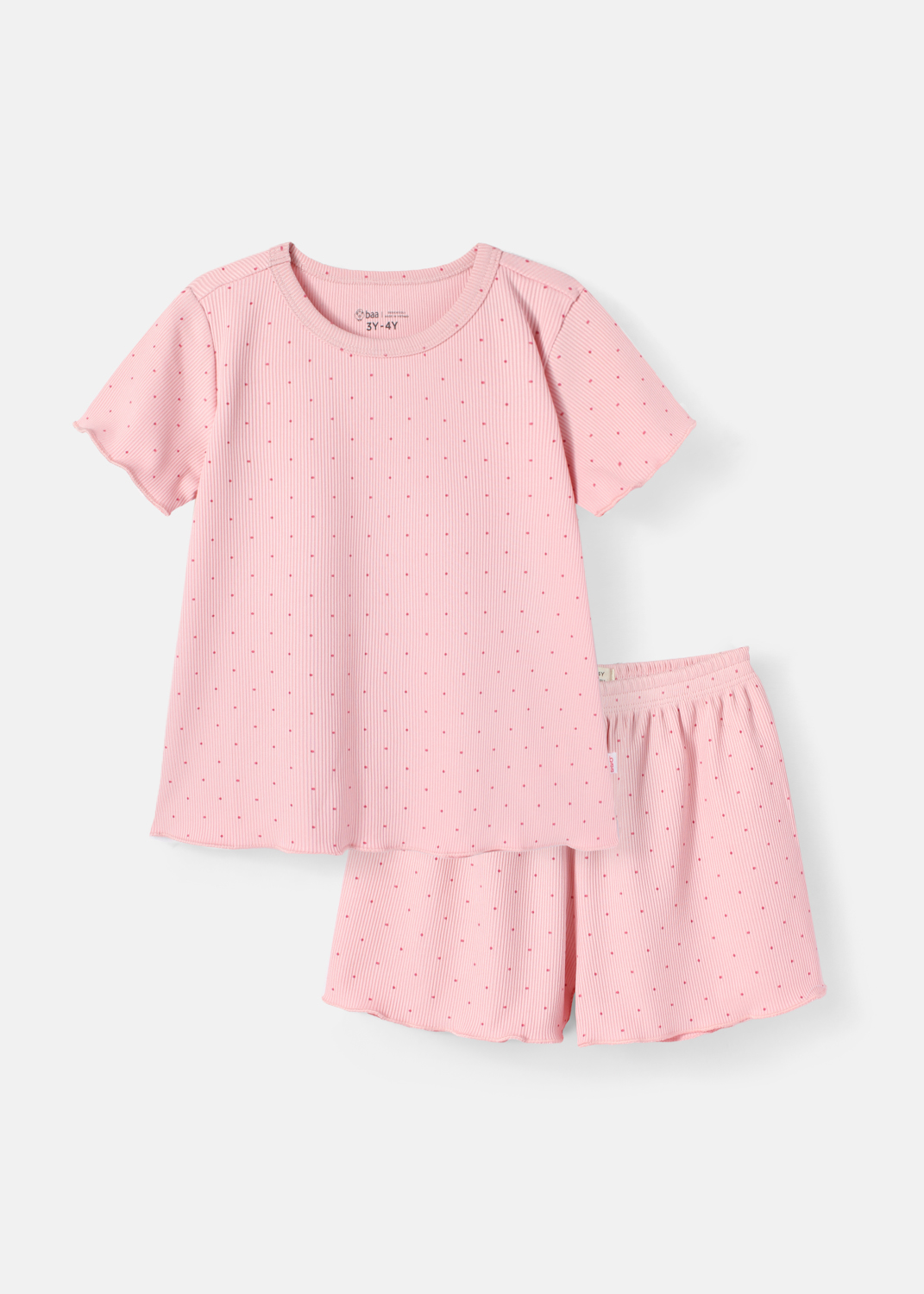 Đồ Bộ Ngắn Tay Bé Gái Thun Gân Hồng Chấm Bi