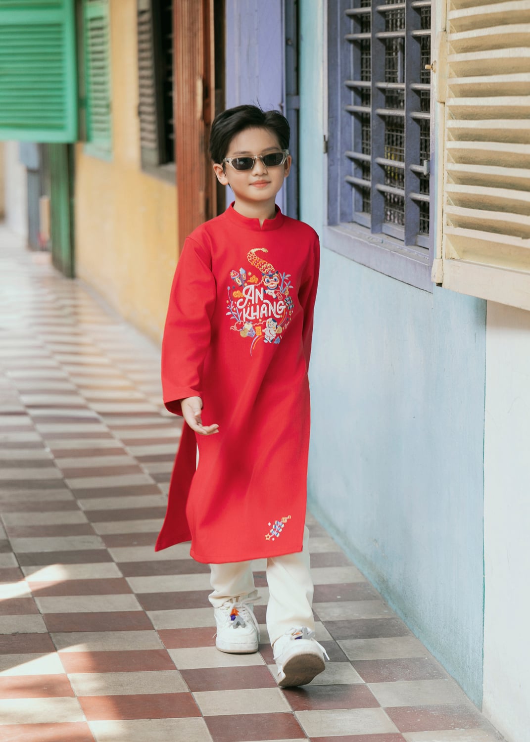 Bộ trang phục được thiết kế dựa trên hình tượng Ngựa Sắt Thánh Gióng – Bình An, Lân Rồng – An Khang, với các họa tiết được thêu tỉ mỉ, sắc nét, như một lời chúc may mắn – mạnh mẽ – vững tâm dành cho bé trong năm mới.