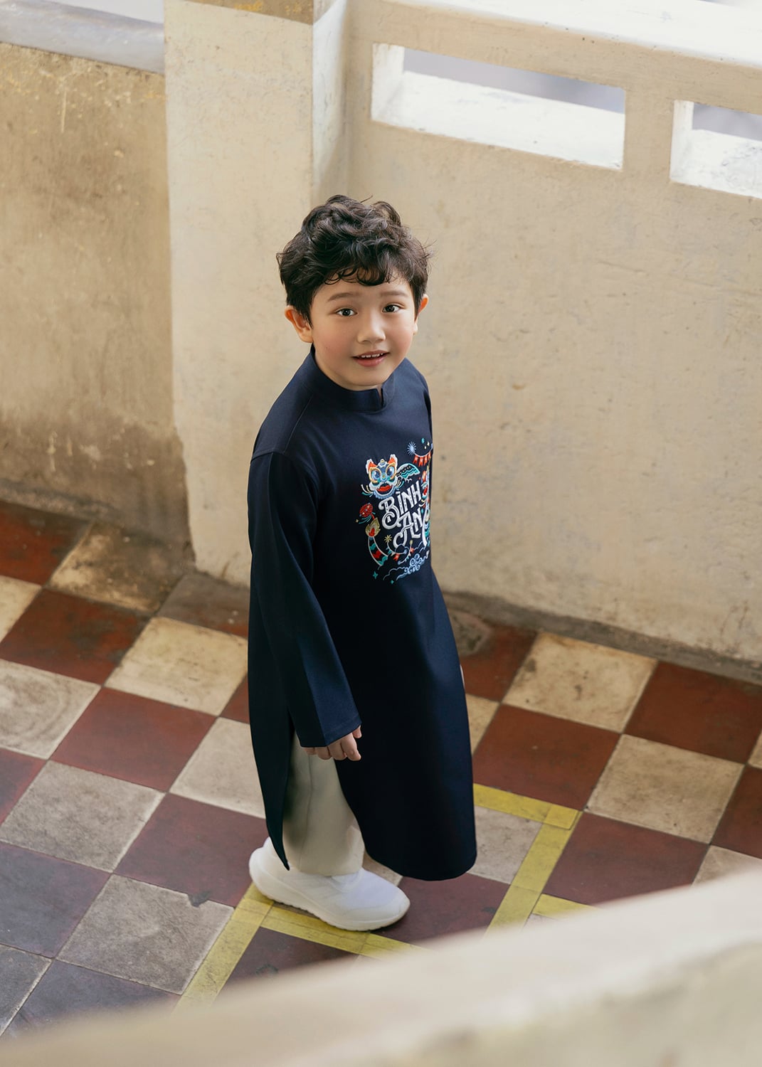 Bộ trang phục được thiết kế dựa trên hình tượng Ngựa Sắt Thánh Gióng – Bình An, Lân Rồng – An Khang, với các họa tiết được thêu tỉ mỉ, sắc nét, như một lời chúc may mắn – mạnh mẽ – vững tâm dành cho bé trong năm mới.