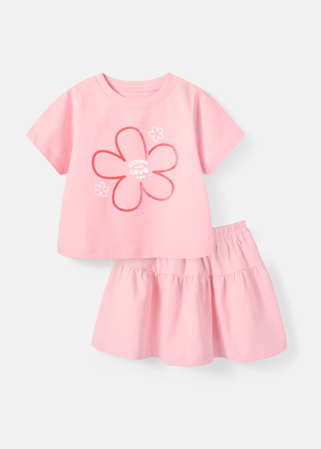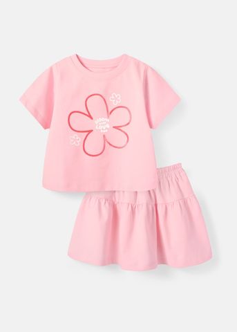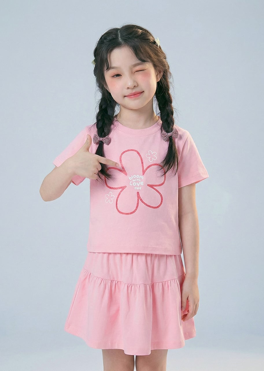 Set Áo Thun & Chân Váy Bé Gái 210gsm Hồng Hoa Xinh Kim Tuyến