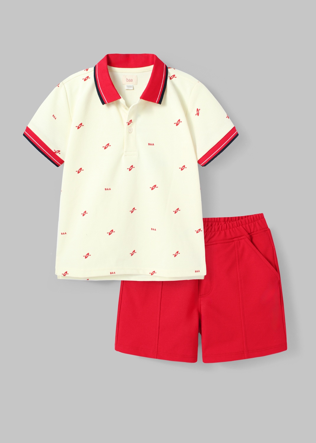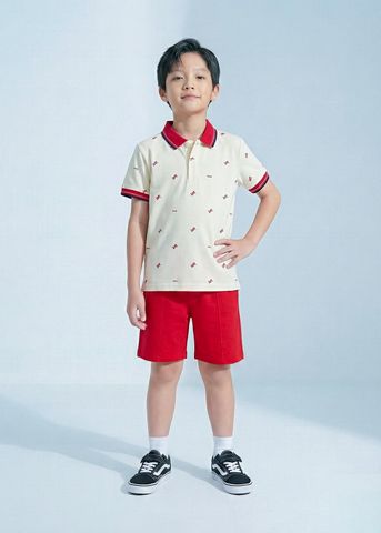Set Polo Cổ Dệt Bé Trai Kem Hoạ Tiết Thuyền Kayak Phối Đỏ